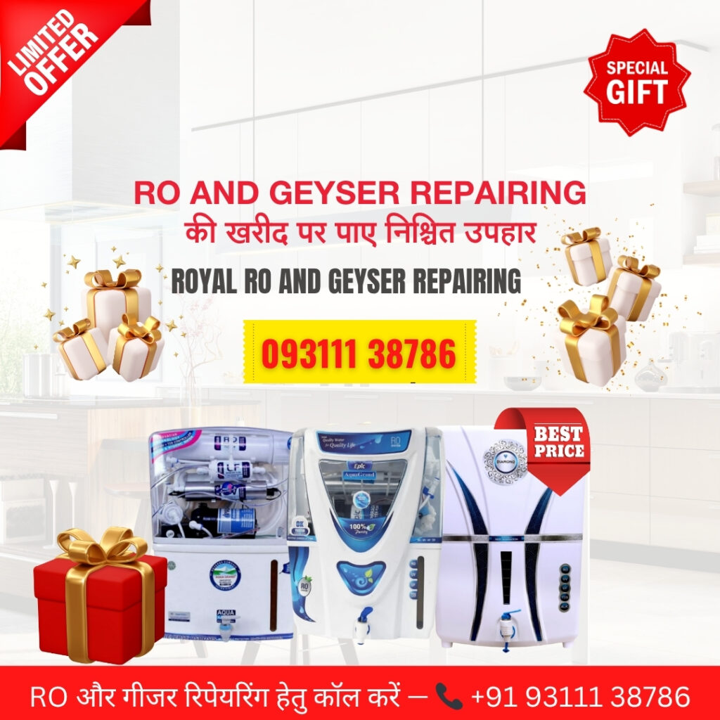 अगर आप RO सर्विस सेंटर नजदीक में या RO रिपेयरिंग इन ग्रेटर नोएडा ढूंढ रहे हैं, तो Royal RO और Geyser Repairing आपके लिए सबसे भरोसेमंद विकल्प है। हमारा अनुभव 15 वर्षों से अधिक का है और हम RO रिपेयर सर्विस इन ग्रेटर नोएडा और गीजर रिपेयरिंग इन ग्रेटर नोएडा में विशेषज्ञता रखते हैं। हम सभी प्रमुख ब्रांड जैसे Kent, Aquaguard, Livpure, Pureit इत्यादि की RO इंस्टॉलेशन, सर्विसिंग और फिल्टर रिप्लेसमेंट करते हैं। इसके अलावा, हमारे प्रशिक्षित तकनीशियन गीजर रिपेयरिंग सेंटर इन नोएडा के तहत गीजर की मरम्मत, इंस्टॉलेशन और मेंटेनेंस भी करते हैं। हम दोरस्टेप सर्विस प्रदान करते हैं, ताकि आपका RO और गीजर घर पर ही तुरंत ठीक हो सके। हमारी सेवाएं भरोसेमंद, किफायती और समय पर उपलब्ध हैं। Shop No. 1015, Surajpur, Greater Noida पर आकर या +91 93111 38786 पर कॉल करके आप अपनी सर्विस बुक कर सकते हैं। हमारे साथ, आपका RO और गीजर हमेशा सुरक्षित और बेहतर काम करेगा।